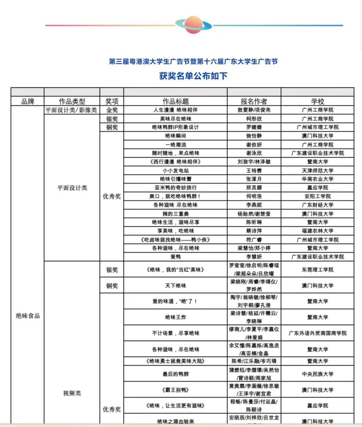 第三届粤港澳大学生广告节暨第十六届广东大学生广告节圆满落幕。商学院电子商务教研室的冯桂兰老师指导的敖雯静、项俊尧、柯彤欣、谢依妍同学在众多优秀作品中脱颖而出,荣获绝味食品平面设计赛道金奖、银奖、优秀奖,并获得金奖奖金3000元、银奖奖金1200元。