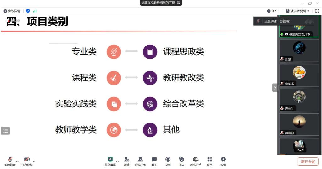 宋教授认为教改课题的研究能力需要从多方面进行培养,只有经过长期的潜心研究,才会产出高质量的研究成果。对线上线下一流课程进行分类,希望大家多报线上线下混合式一流课程,也希望老师们在实践中思考,在行动中研究,在申报过程中注重学术观点的创新性和研究方法的科学性,以提高课题立项的成功率。