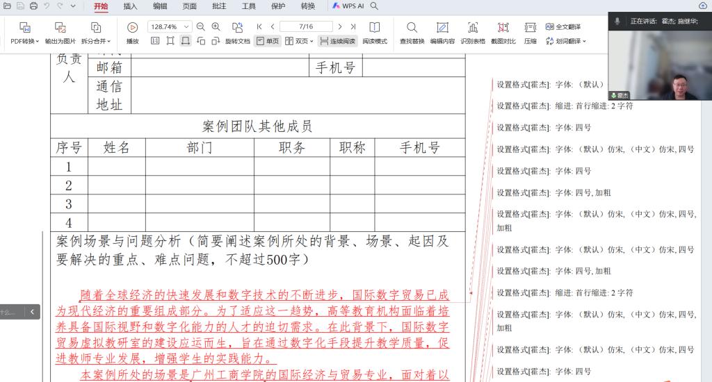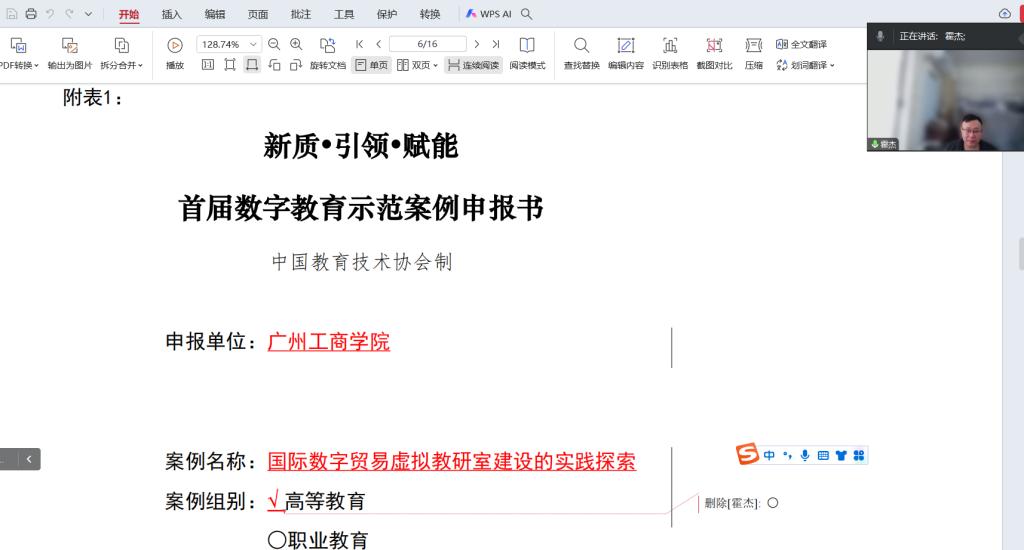 为推进数字化教育改革,推动现代教育教学质量的提升,2024年10月16日,ky开元集团官网商学院国际经济与贸易专业特邀霍杰副教授参与“首届数字教育示范案例”申报书的线上打磨与完善工作。此次申报书主题为《数字赋能提质——ky开元集团官网国际数字贸易虚拟教研室的探索与实践》,旨在展示数字化教育在国际经济与贸易领域的创新实践与成效。