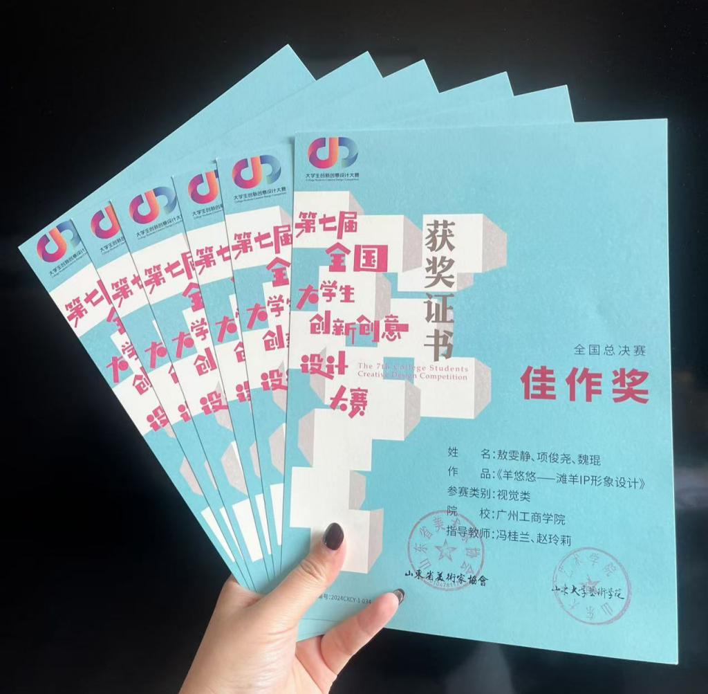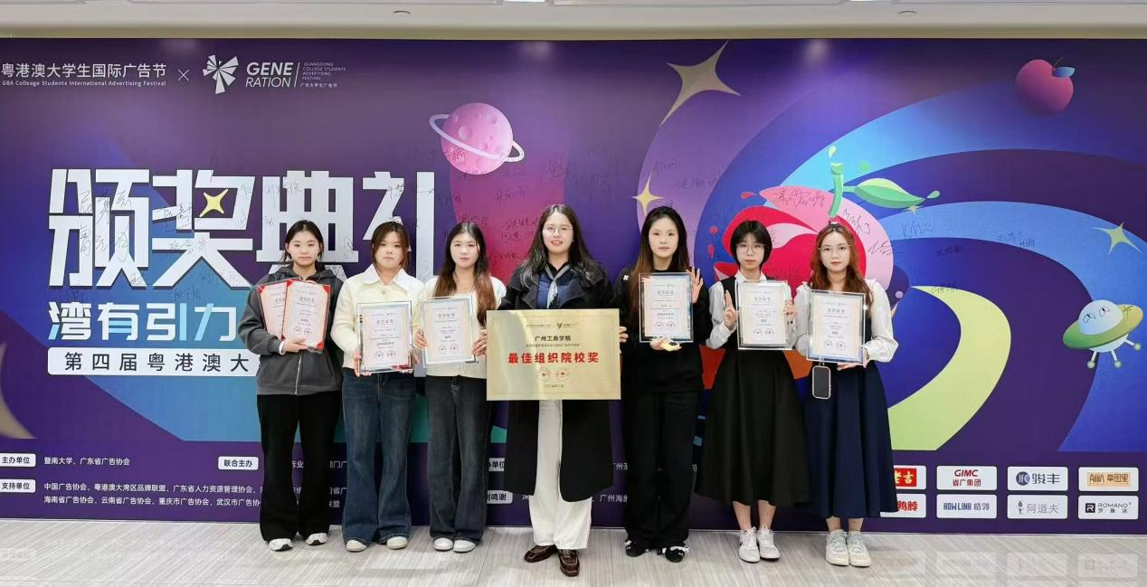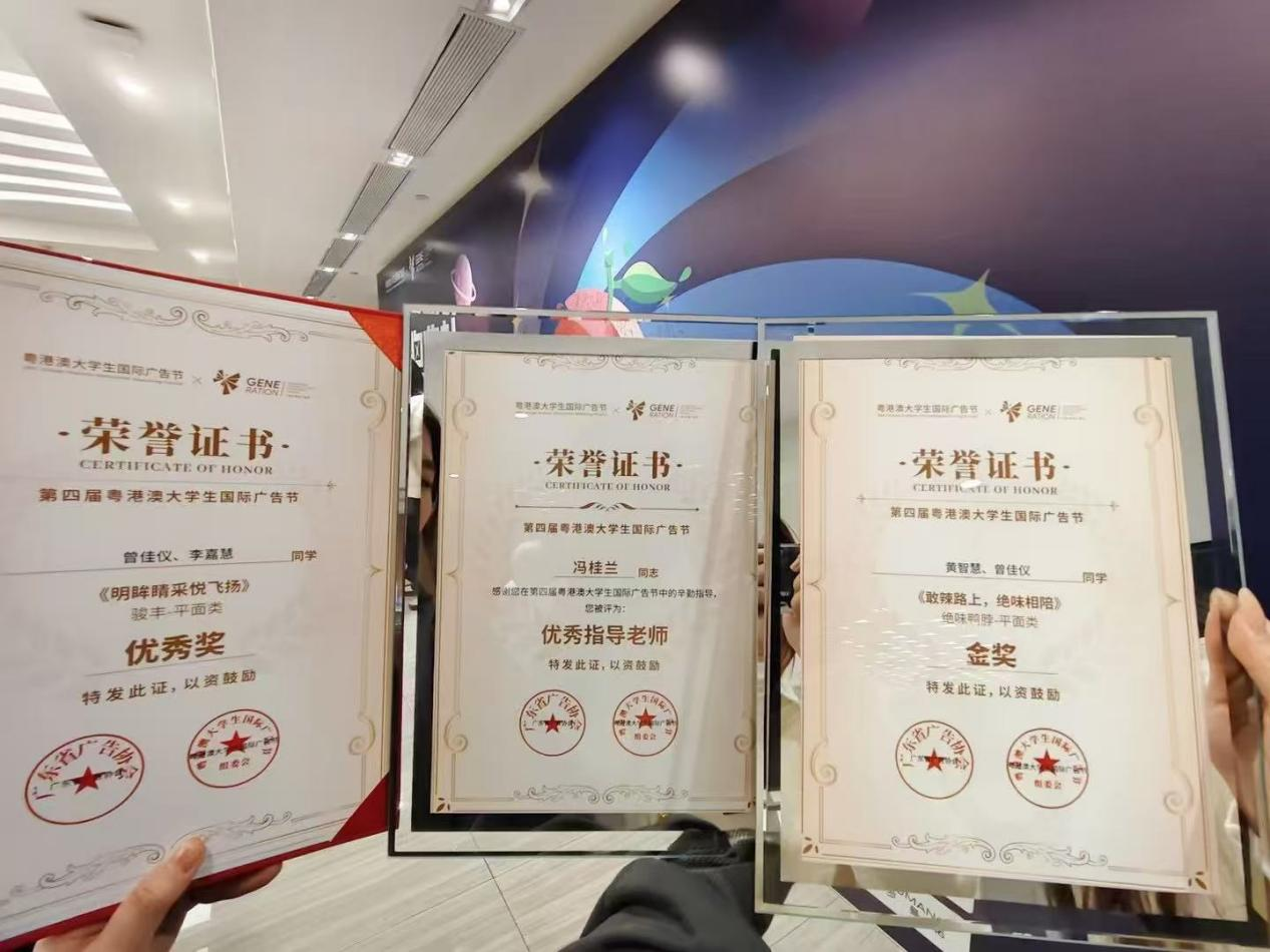 2024年寒假期间,商学院电商教研室《网络广告策划与设计》课程以赛促教成果丰硕,34位同学累计斩获国内外大奖21项。在第四届粤港澳大学生国际广告节中,冯桂兰老师指导的黄智慧团队荣获国家级金奖,刘笑帆老师指导的孔焰敏团队、詹慧怡团队分别荣获国家级银奖两项。在ICCC国际大学生文化设计大赛(中国赛区)中,冯桂兰老师指导的任钧昊等团队荣获国家二等奖、三等奖3项,在第三届香港数字艺术设计大赛,张婷老师指导的黄国栋团队荣获三等奖。在第七届全国大学生创新创业设计大赛中,冯桂兰老师指导的袁奉遥等团队荣获国家特等奖、一等奖6项。同时,冯桂兰、刘笑帆老师在第四届粤港澳大学生国际广告节设计大奖中荣获全国优秀指导老师奖、冯桂兰老师在ICCC国际大学生文化设计大赛(中国赛区)中荣获全国优秀指导老师奖。