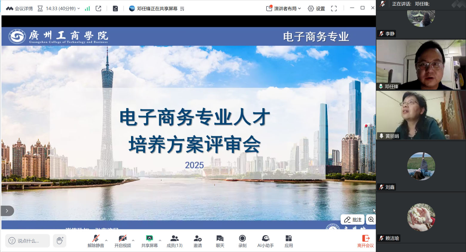 为精准对接粤港澳大湾区经济发展需求,优化电子商务专业人才培养体系,提升人才培养质量,2025年7月1日,商学院电子商务专业以腾讯会议形式召开电子商务人才培养方案评审会。校外专家、广东省电子商务教指委副主任委员兼广州大学电子商务研究院执行院长黄丽娟教授受邀参会,电子商务专业负责人邓任锋高级工程师主持会议,教研室主任梅思阳博士、教研室副主任刘鑫老师、赖洁瑜副教授、易巧副教授等12位师生代表共同参与评审研讨。