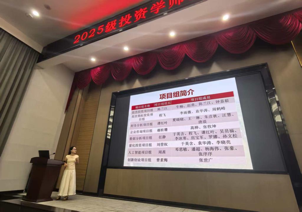 会议的下一个环节是各项目组组长介绍项目组的基本情况。投资学专业的每位新同学除了拥有导师护航成长以外,还可以自愿选择参加一些项目组。项目组主要由资深教师带领学生深入参与真实项目的全流程。依托行业资源与企业合作,通过“做中学”模式,学生不仅掌握专业技能,更提升团队协作、问题解决及项目管理能力。项目组注重理论与实践结合,鼓励创新思维,助力学生从校园到职场的无缝衔接,培养兼具实战力与创新力的复合型人才。股票投资项目组、期货期权投资项目组、财务分析项目组、量化投资项目组、创新创业项目组等八个项目组组长详细介绍了各组的培养目标、工作内容和成果预期。这种“做中学”的培养模式引起了新生的浓厚兴趣,大家认真记录,眼神中充满期待。