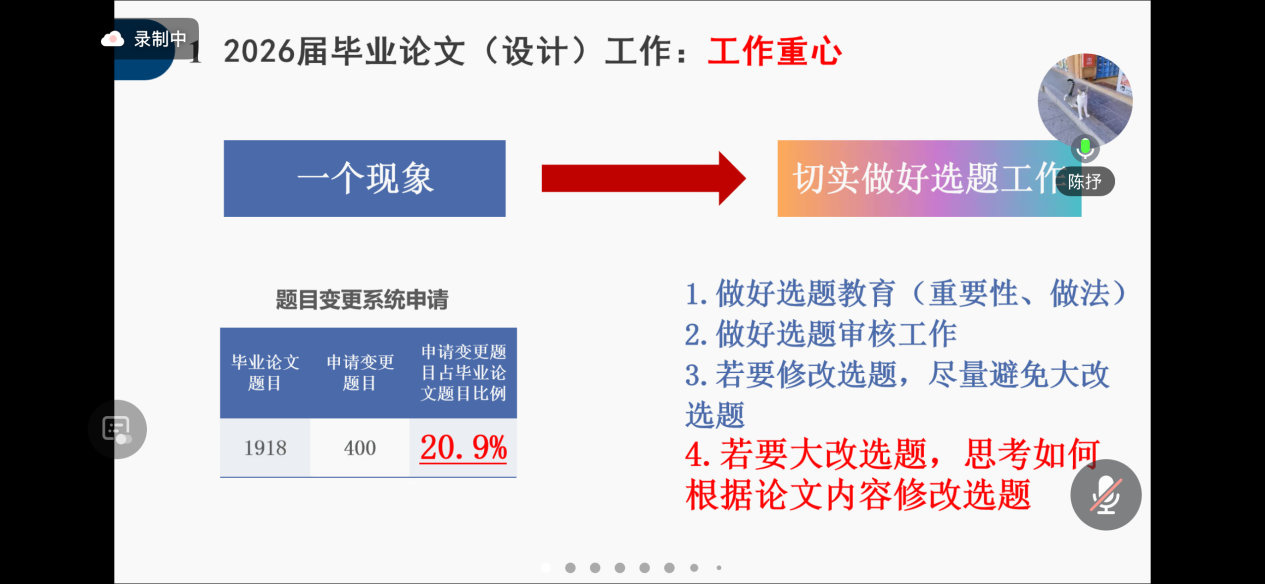 会上,专业带头人谭晓丽教授以“论文选题的红线规避与质量把控” 为主题展开深度讲解。她结合多年学术评审经验,系统梳理了选题环节易触碰的七大 “红线”,重点强调选题既忌过于宽泛导致研究浮于表面,也忌过于冷门造成数据支撑匮乏。针对当前学术研究中的突出问题,谭教授特别指出,选题需兼顾科学性与时代价值,要与专业培养目标紧密契合,同时严格规避抄袭借鉴、重复研究等学术不端风险,引导指导老师在选题阶段做好源头把控,帮助学生确立精准可行的研究方向。