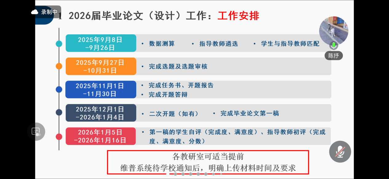 最后,陈抒副主任围绕毕业论文工作推进与学术规范要求开展部署。他首先向全体指导教师宣布了2026届毕业论文各阶段的时间安排框架,明确各环节工作的先后逻辑与整体节奏,为指导教师统筹规划指导工作提供清晰依据。同时,陈抒副主任着重强调学术端正的重要性,明确指出毕业论文必须由学生独立完成,严禁任何形式的代写、代投等学术不端行为。他要求指导教师在指导过程中加强对学生学术诚信的教育引导,严格审核论文原创性,对发现的学术不端苗头及时干预、严肃处理,从根本上维护学术公平与学术尊严,确保毕业论文工作的严肃性与规范性。