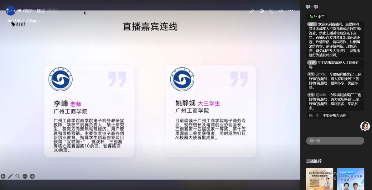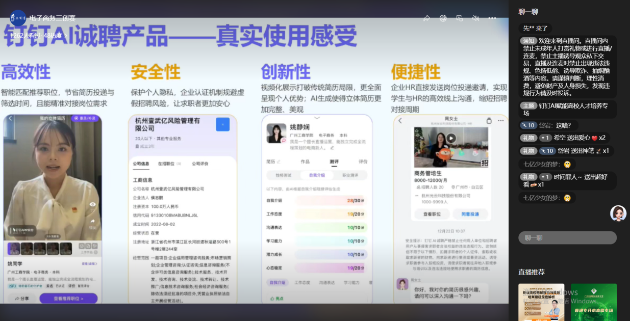 2025年12月26日,ky开元集团官网电子商务专业李峰老师、姚静娴同学受邀作为嘉宾,亮相“钉钉AI赋能高校人才培养专场”直播活动,围绕AI技术在电商领域的应用与人才培养实践展开分享,展现了ky开元电商专业人才的综合实力,也标志着ky开元电商人才培养成果获得行业及钉钉集团的高度认可,更彰显了专业“产教融合、赛教融合”培养模式的显著成效。