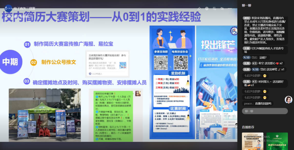 作为往届三创赛获奖选手与首批钉钉AI校园大使成员,姚静娴同学从实践视角分享了自身经历。她畅谈了担任钉钉AI校园大使的责任与感悟,重点介绍了使用钉钉AI诚聘产品的直观体验 ——立体简历生成、精准岗位匹配等功能,让求职表达更具创新性与针对性。同时,她还分享了校内简历大赛的策划经验,从活动主题设定、赛程设计到评委邀请,详细拆解了如何将AI工具融入赛事组织,帮助同学们提升求职竞争力,该赛事也成为专业“以赛促学” 的典型实践。