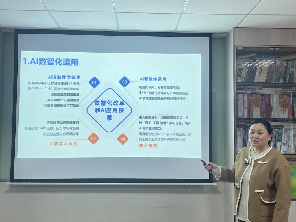本次说课会议历时近四小时,内容充实、研讨深入,充分展现了投资学专业教师拥抱技术变革、深耕教学创新的精神风貌。通过说课交流与集体打磨,各课程进一步明确了AI赋能教学的实施路径,为提升专业课程质量、打造数智融合“金课”奠定了坚实基础。投资学专业将继续以教学改革为抓手,推动专业建设迈向更高水平。