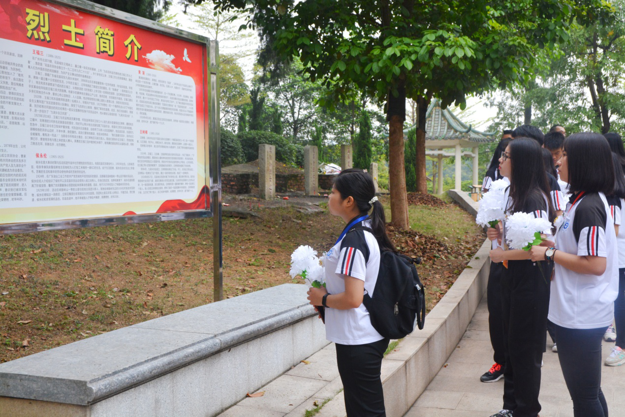 所有参加扫墓的师生乘车到达烈士陵园后,在辅导员老师的带领下徒步进入烈士陵园,在党务站谭浩辉同学的主持下扫墓活动正式开始。首先,全体党员在烈士墓碑前低头鞠躬并默哀,寄托对烈士的哀思,在为烈士们敬上装载着崇敬之意的花圈之后,同学们低吟致悼词来表达心中那份对先烈的沉重情感,以示对先烈们的缅怀和敬意。然后由学生党员代表邹雅文同学为大家讲述花都英烈们为了全国人民的解放,为了保卫和建设富强的社会主义祖国,英勇奋战、前赴后继,抛头颅扫热血的英雄事迹,在讲解中,仿佛重现了血雨腥风的战争岁月,中华民族的优秀儿女们为了人民的幸福生活,不惜抛头颅,洒热血的场景。最后由党务站谭浩辉同学领誓,在纪念碑下重温入党誓词,并庄严承诺将努力学习,继承和发扬革命先烈的遗志,为祖国的建设和发展奉献自己的青春和热血。