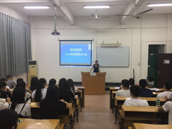 为贯彻落实我院2017级新生招生政策,加强我系17级助班队伍建设,提高助班的学习与工作技能,我系于6月9日下午在实验楼101召开2017级助班培训大会。经济贸易系学生工作负责人张娜老师,经贸系2017级新生辅导员雷婧老师、江振纲老师、王兆麒老师及2017级全体助班出席此次培训大会。