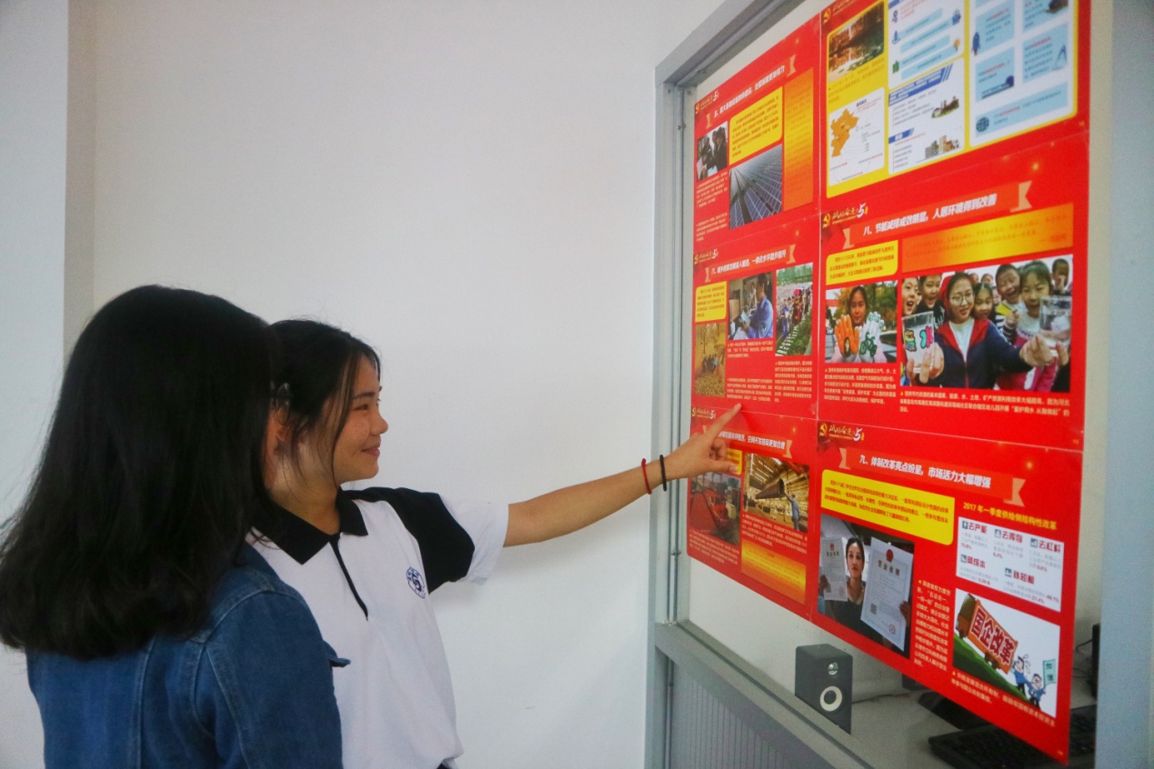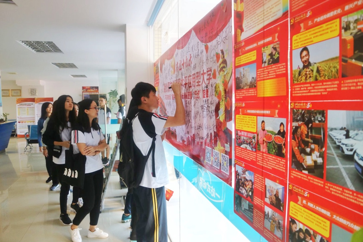 本次图片展通过文字、图片相结合的方式,以社会生活的方方面面展现了新中国经济的发展和社会的进步历程,旨在让青年大学生铭记历史,弘扬爱国主义精神,激发他们爱祖国、爱人民、爱党的热情。全体同学认真学习党的十九大的图片内容,并将习近平总书记在党的十九大报告中所提到的“习近平新时代中国特色社会主义思想是全党全国各族人民为实现中华民族伟大复兴而奋斗的行动指南”的内容铭记在心,用党的十九大精神统一思想认识和规范行为,做到一心一意跟党走。同学们也意识到在日常的生活学习中,要时刻坚持用“以德为行,以学为上”的思想引领我们努力的方向。认真学习领悟图片展的内容后,大家在“喜迎十九大”的签名板上庄重地签上了自己的姓名。