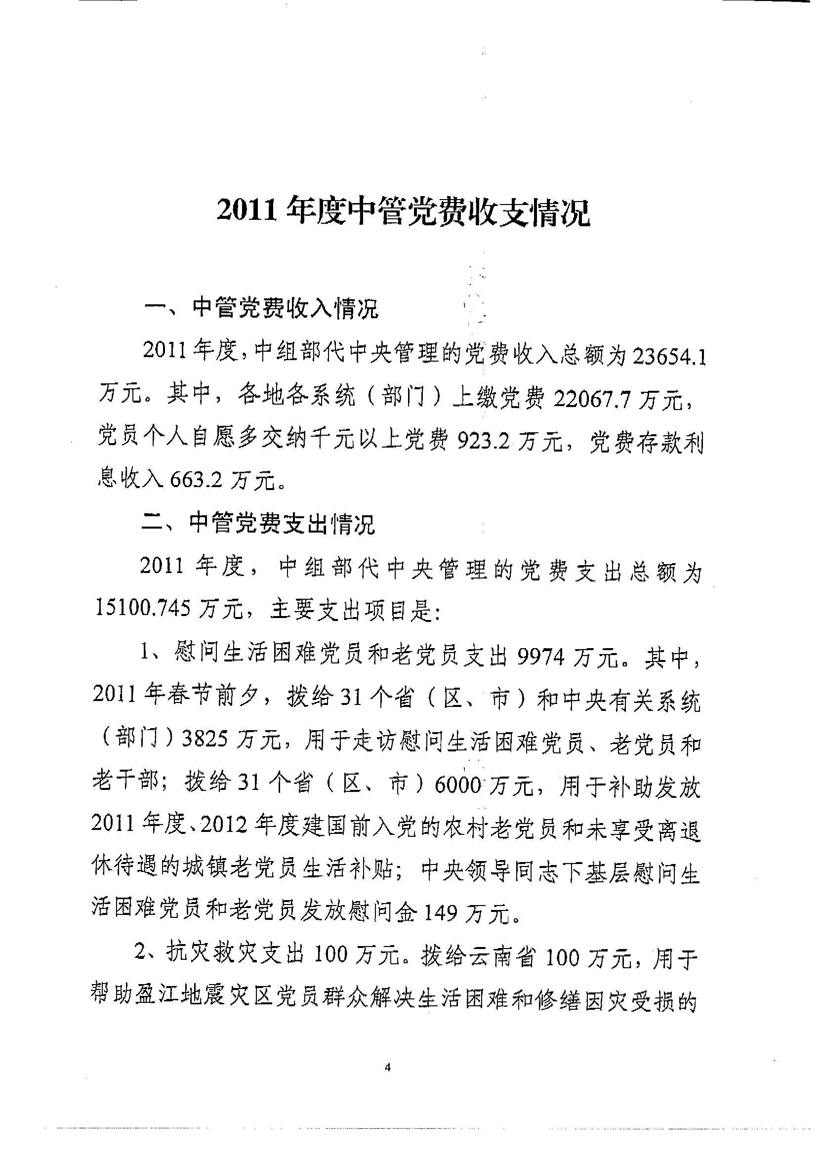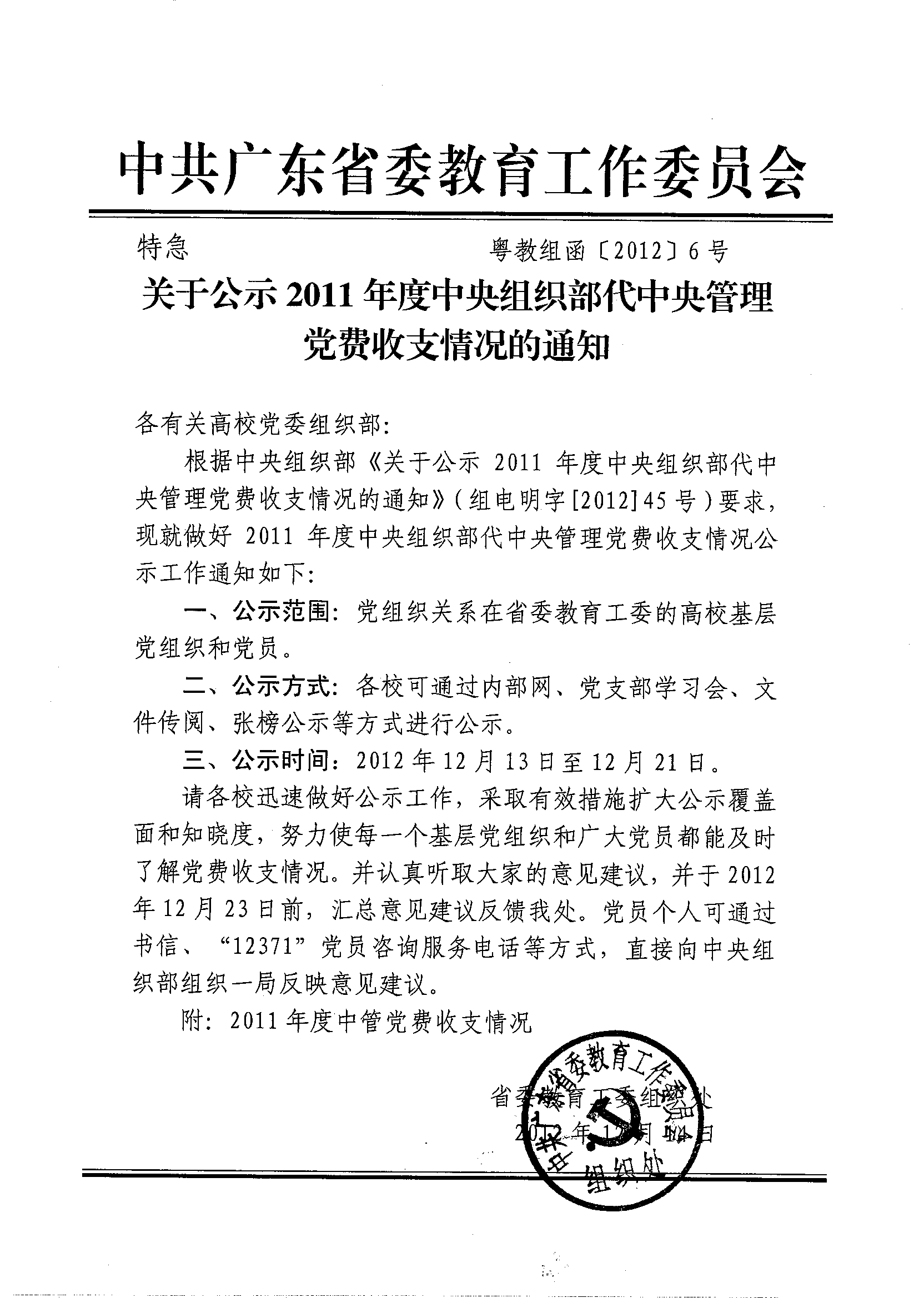 关于公示2011年度中央组织部代中央管理党费收支情况的通知