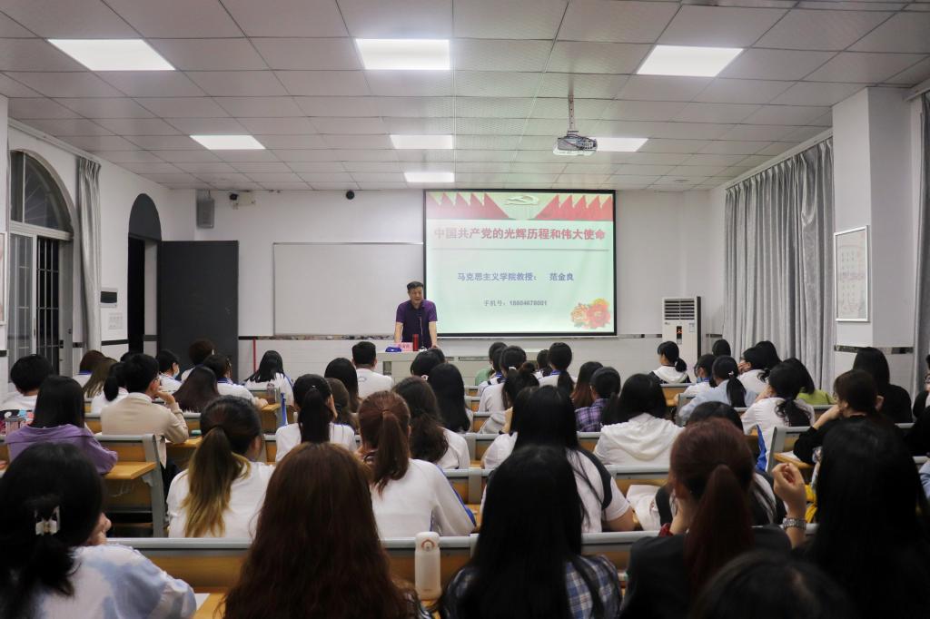 授课过程中,范金良教授以《中国共产党的光辉历程和伟大使命》为题,从中国共产党的百年奋斗历程及启示两部分开展授课,围绕中国共产党的诞生,成立的历史背景、创立的条件、党的光辉历程与伟大历史革命,党在发展中完成的三件大事和新时代党的发展新阶段进行讲述,回顾了中国共产党从无到有、从弱到强,带领人民建立新中国的大量历史事件和光辉历程。他以鲜明的观点、精炼的语言,全面总结了党的百年奋斗历程中的重要启示,引导全体师生党员对党和国家的历史有了更深刻的理解,更清晰感受到百年党史丰富的经验启示和精神力量。