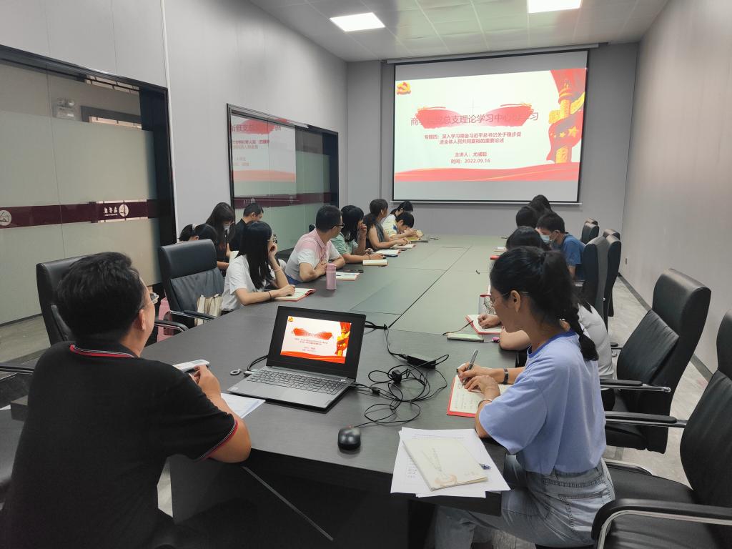 2022年9月16日下午,商学院党总支理论学习中心组于商学院618会议室组织商学院党员同志进行“深入学习领会习近平总书记关于稳步促进全体人民共同富裕的重要论述”专题学习。本期专题学习由教工第二党支部书记尤彧聪同志牵头做专题学习报告。