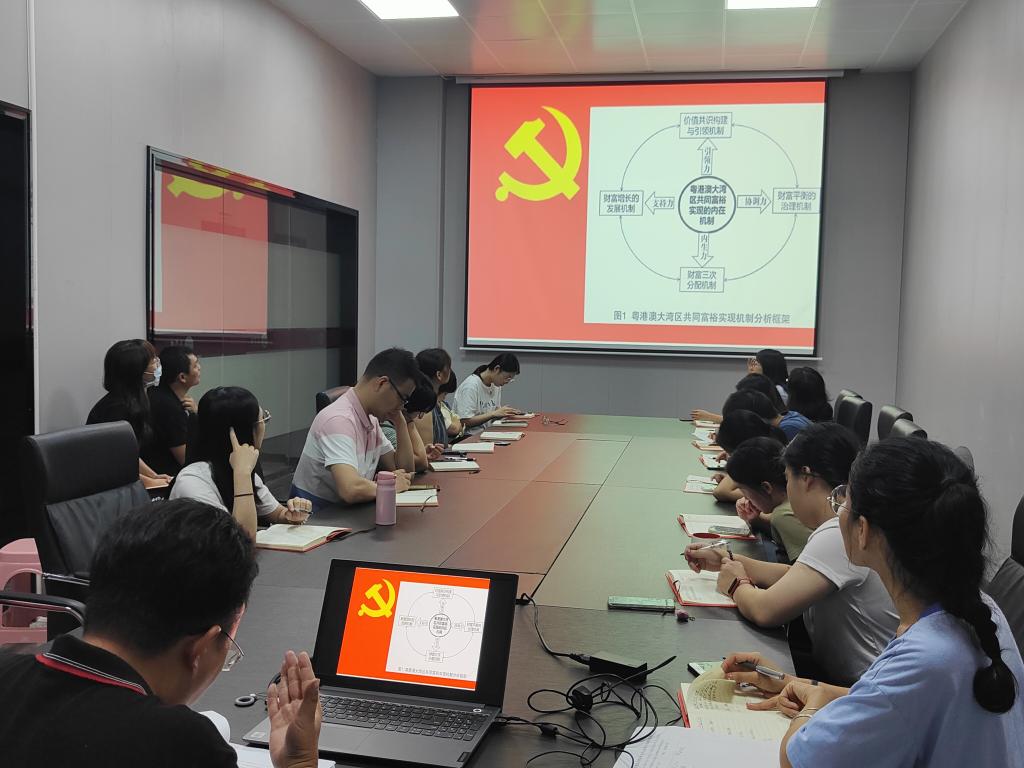 在结合学院商科专业建设与粤港澳大湾区协同发展,推进共同富裕的思考中,尤彧聪同志提到,共同富裕要促进区域协调发展与生态文明经济发展, “城校共生”“链群共长”是推动经济高质量发展的新思路。此外,尤彧聪同志在学习会上分享了“粤港澳大湾区共同富裕实现机制分析框架”,并详细解析了实现粤港澳大湾区共同富裕的“四力”共发的内在机制。