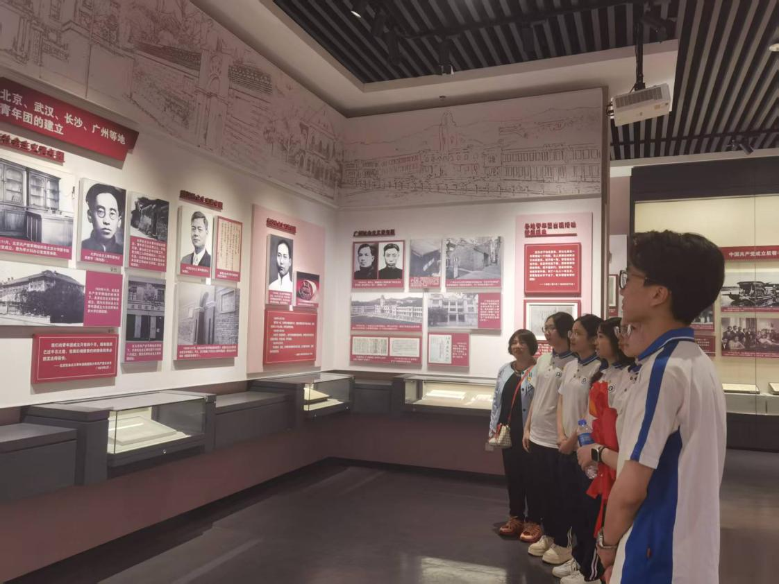 随后,师生党员们来到团一大纪念馆参观学习。纪念馆采用岭南传统园林式布局,地上地下共设约1200平方米展览空间。地上展厅为“中国共产党领导下的中国社会主义青年团创建历史陈列”,地下展厅为“党旗下的青春——新中国成立前牺牲的团一大代表和团一届中央执委会成员”专题展。