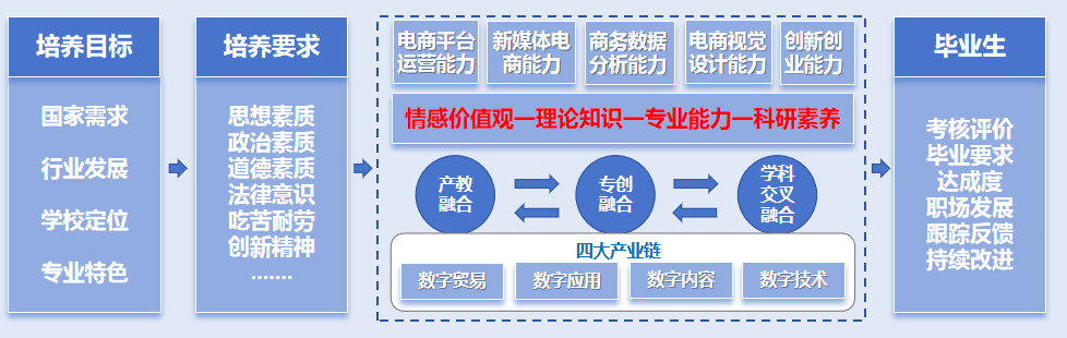目标2:具有扎实的电子商务专业知识,具备数字技术、产业经济、现代信息和经营管理等跨领域知识融通能力和实践应用能力,具有勇于挑战、锐意进取的创意、创新、创业的“三创”精神,能够运用专业知识解决电子商务领域的实际问题;