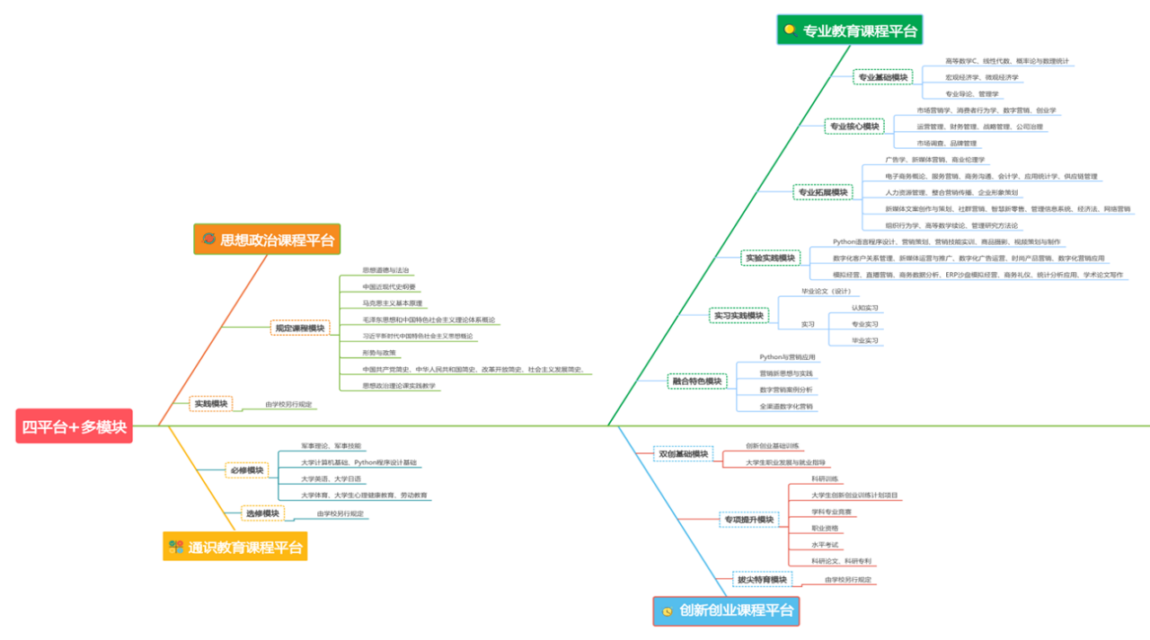 本专业按照“四平台多模块”理念设置课程体系,将市场营销课程体系划分为思想政治课程、专业教育、通识教育、创新创业课程四个主要平台,并在每个平台下设置多个模块,以形成有机、系统的知识结构(具体见图1),从而全面提升学生的专业素养和实践能力。