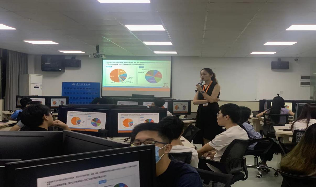 同学们首先通过视频了解中国外贸运行情况,及当下数字贸易的行业的现状。培训会通过分析广州、深圳、东莞的就业现象来让同学们更好的了解如何选择就业的地区,同时老师们还分享了国际贸易的就业岗位、方向,以及自己的工作经验,为同学们选择就业方向提供了参考。