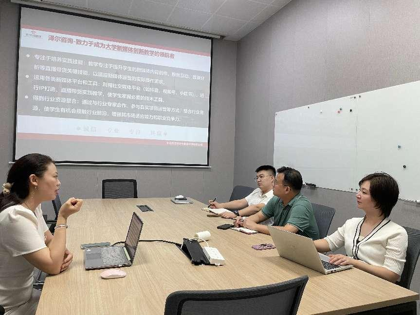 2024年10月10日下午,商学院623会议室开展了一场别开生面的交流会。东莞市泽尔企业管理咨询有限公司的负责人黄梅华,商学院电子商务专业负责人邓任锋高级工程师,教研室易巧主任、梅思阳主任,教师刘千千参加此次会议,共同探讨校企合作的新模式。