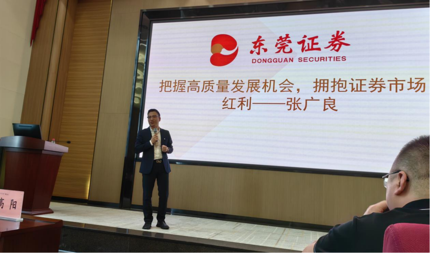 随后,东莞证券(龙岗营业部)总经理张广良上台,就“把握高质量发展机会,拥抱证券市场红利”这一主题进行了深入阐述。张广良表示,金融是国家经济发展的核心,证券行业作为资本市场的重要组成部分,正面临着前所未有的发展机遇。他详细分析了中国证券行业的前景,从国家层面、企业融资层面到居民资产配置层面,全面展示了证券行业的广阔前景。张广良鼓励学生们要敏锐捕捉市场变化,积极拥抱证券市场带来的红利,实现个人价值的最大化。