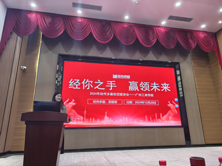 苏丽君经理随后以“梦想起航,赢在职场”为主题,从个人职业发展的角度出发,分享了如何在竞争激烈的职场中脱颖而出,特别是在投资这一充满挑战与机遇的领域。她结合自己在经传多赢的亲身经历,讲述了公司文化、发展历程以及对于人才的重视与培养体系,让学生们对这家企业有了更加直观而深刻的认识。