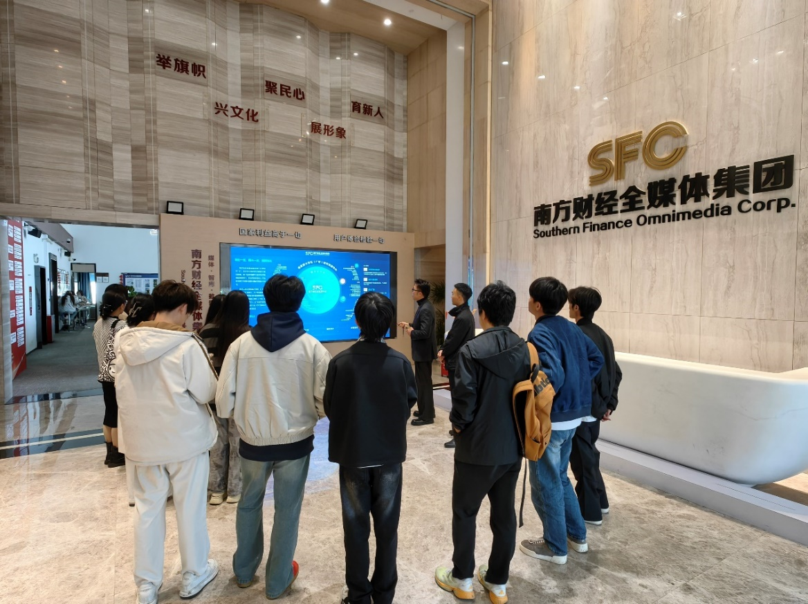 在南方财经总部大楼的展示中心,学生们受到南方财经大湾区资本市场服务中心执行总经理丁栩先生及运营经理郑何平的热情接待。展示中心内,一幅幅生动的画面和详实的数据深深吸引了学生们的目光。这里全面而系统地展示了南方财经全媒体集团的主要业务板块,涵盖了媒体业务、智库服务、数据业务以及交易业务等多个领域。南方财经集团以21世纪经济报道、21财经APP、经视频道、股市广播为核心,构建了一个涵盖多种介质的全媒体矩阵,并通过创新的“中央厨房”平台,实现了优质内容和传播渠道的深度融合,成功打造出具有强大市场竞争力的财经全媒体集群。