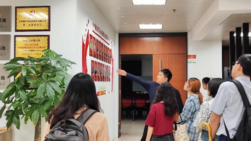 下午三点,交流团队到达企业后,营运中心陈超琦总经理带领师生团队参观了大参林的企业文化,详细介绍了大参林为消费者服务的理念。