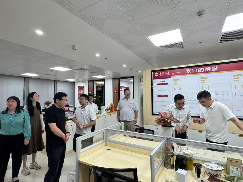 当日,东莞证券深圳龙岗营业部总经理张广良、经理高阳热情接待了来访教师,并陪同参观营业部核心办公区域。作为开放式办公空间,各业务团队在统一布局中高效协作:财富管理团队正围绕客户需求研讨资产配置方案,数据屏上实时更新的市场动态为决策提供支撑;投资咨询岗位的资深顾问通过一对一沟通,为客户解析投资策略与风险要点;后台运营团队专注于合规审查与系统维护,确保业务流程严谨有序。老师们穿行于开放式办公区,直观观察证券开户、投资产品营销、客户服务等业务的全流程操作,真切感受金融企业“以客户为中心”的服务理念与数字化办公模式。