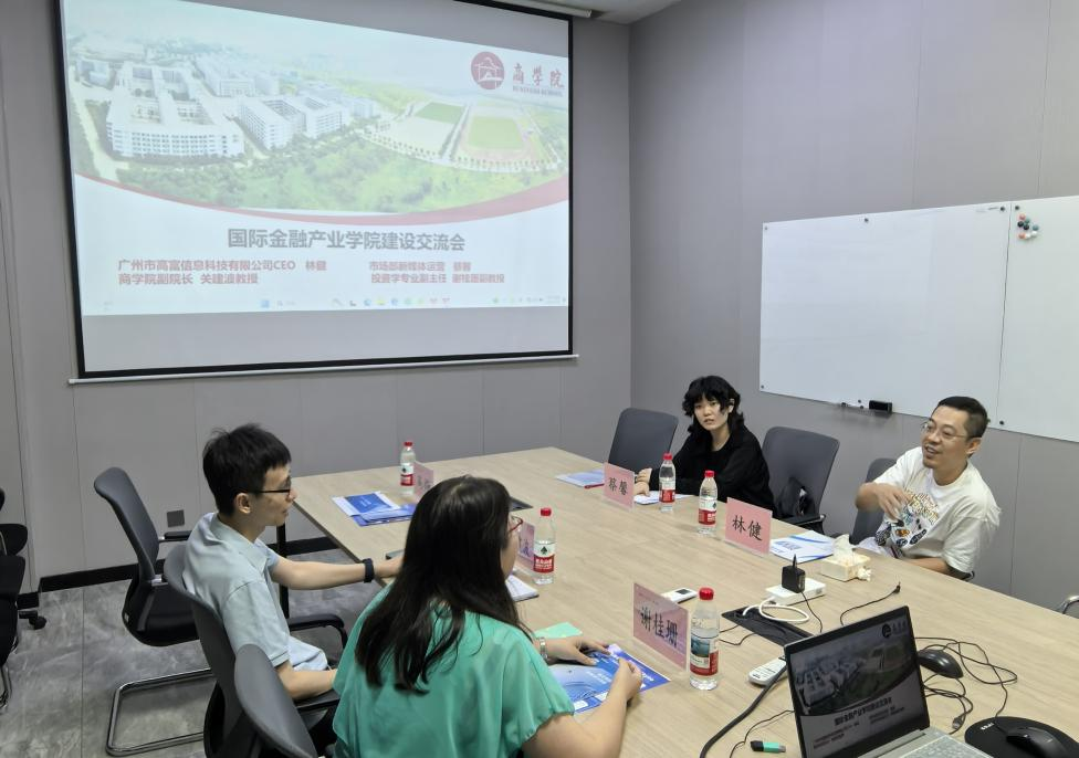 商学院关建波副院长对高富公司一行的到访表示热烈欢迎。交流伊始,关建波副院长简要介绍了商学院的专业结构、在校生人数、人才培养特色、人才培养成效等情况。接着,投资学专业副主任谢桂珊向到访嘉宾介绍了投资学专业的专业特色、师资力量、实践平台、师生竞赛获奖、就业方向等情况,也介绍了新增专业金融科技的专业优势、核心课程、师资力量以及就业方向。