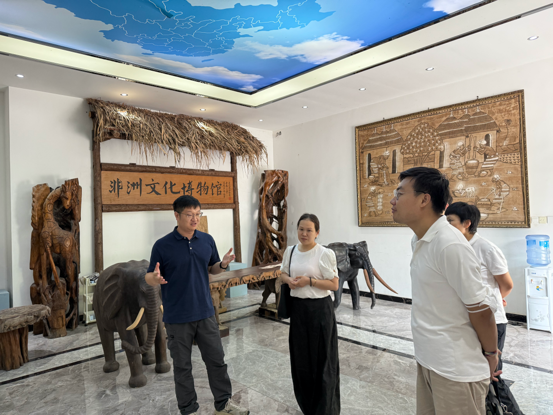 在企业方领导的陪同下,团队一行首先参观了公司独具特色的非洲文化博物馆。通过丰富的实物展陈与详尽的讲解,大家深入了解了非洲大陆多元的文化背景、消费习惯及市场环境,为理解跨文化商业实践奠定了感性基础。随后,一行人参观了公司的出口产品展厅,实地考察了适合出海非洲的各类商品及其运营模式。