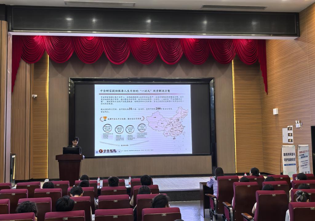 讲座的第一部分由投资经理陈海峰主讲。他以“投资理财市场概览”为主题,宏观梳理了当前全球及中国资本市场的格局与趋势,从居民资产配置的演变到金融产品的多元化发展,为同学们构建了一个清晰的投资地图。陈经理强调,理解市场全貌是做出明智投资决策的第一步,鼓励同学们建立长期、理性的投资视角。