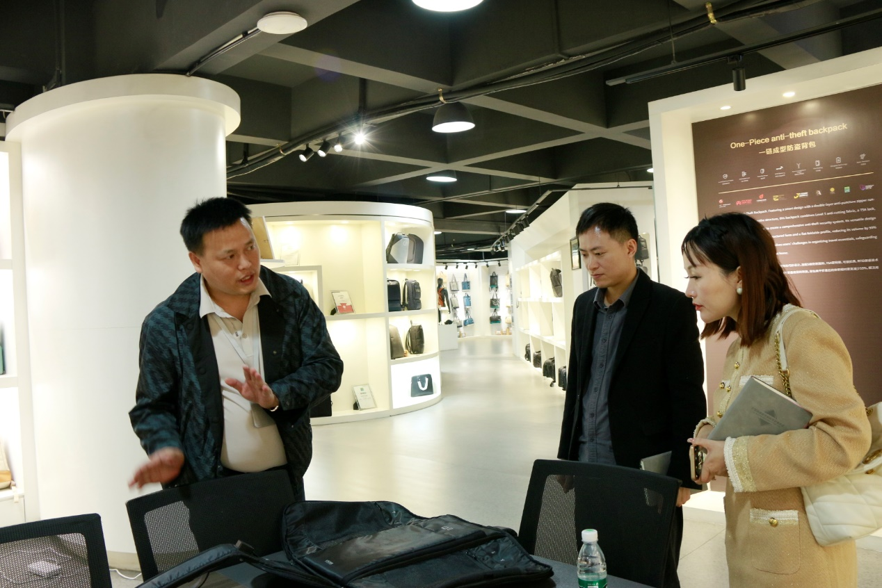 会谈结束后,在公司总经理黄燕耿先生的陪同下,曹明香主任一行参观了金圣斯集团的箱包产品展厅。展厅内琳琅满目的箱包设计兼具时代美感与人文情怀,其精湛的工艺与创新的理念给来访教师们留下了深刻印象。
