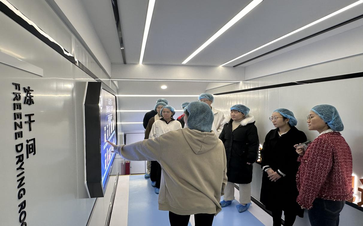 会议结束后,在肖师兄和李总监的带领下,学生们参观了企业的生产车间。在这里,学生们亲眼见证了冻干粉、冻干面膜等热销产品从原料配比、生产加工到成品包装的整个过程。现代化的生产线、严格的品质控制以及员工们严谨的工作态度,让学生们备受震撼。