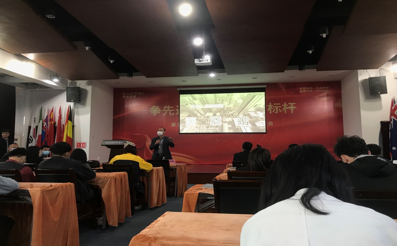 接着,人力资源总监朱世豪在会议室对豪美新材进行详细的讲解,公司的发展历程、产品制造、资质与荣誉、产品应用领域、公司晋升机制、内部工作氛围以及未来发展前景进行详细的介绍。