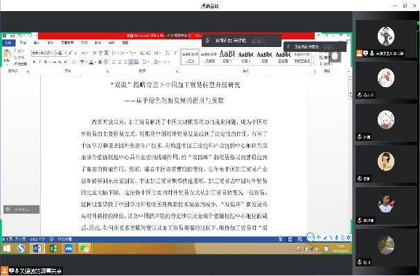 随之,各参会人员作了本周研究进度汇报。关建波博士首先在会上提出,基于绿色创新发展的衡量与贡献,对“双碳”战略背景下中国加工贸易转型升级进行研究。参会人员围绕该论题,对中国加工贸易转型进行了广泛的探讨。然后,袁柳博士分享了近期拟写的论文“进口技术复杂度与企业能源效率”,讲述该论文的研究对象、研究方法及当前的研究困难。然后,尤彧聪副教授分享了近期搜集的关于空港经济(airport economy)的外文文献,并进行深入的探讨;另外白雪博士就其论题中的 “临空产业”进行了明确。最后,其他参会人员均对本周的研究开展了进一步的探讨。(商学院 曾莉婷)