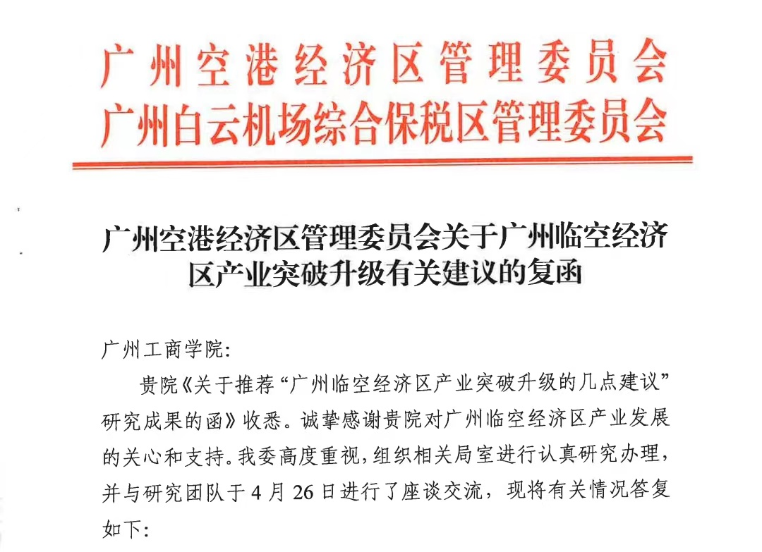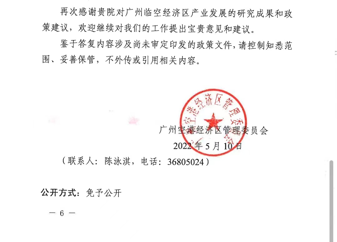 5月10日,ky开元收悉广州空港经济区管理委员会、广州白云机场综合保税区管理委员会关于《广州临空经济区产业突破升级的几点建议》资政报告批复函,对于林波博士及关建波博士相关建议高度评价,并于4月26日组织广州空港委相关局室领导与研究团队进行了座谈交流。批复函表达了对ky开元研究团队的感谢,希望研究团队继续开展相关问题研究。