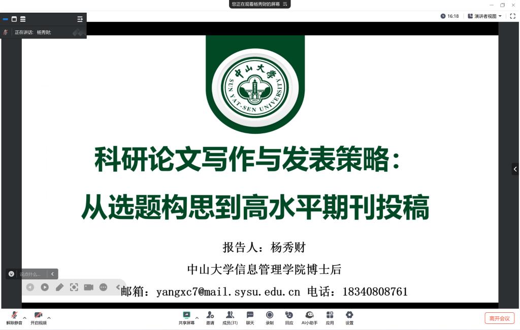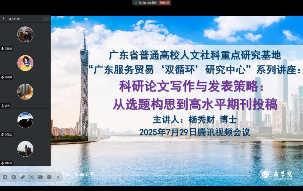 为进一步提升学院教师高水平论文写作与发表能力、技巧,促进学院学科发展,推动硕士培育点建设,商学院于2025年7月29日下午3点举办主题为《科研论文写作与发表策略:从选题构思到高水平期刊投稿》的线上学术讲座。讲座特邀中山大学信息管理学院博士后杨秀财博士担任主讲,共吸引了近40名教师参加。讲座由商学院关建波副院长主持。