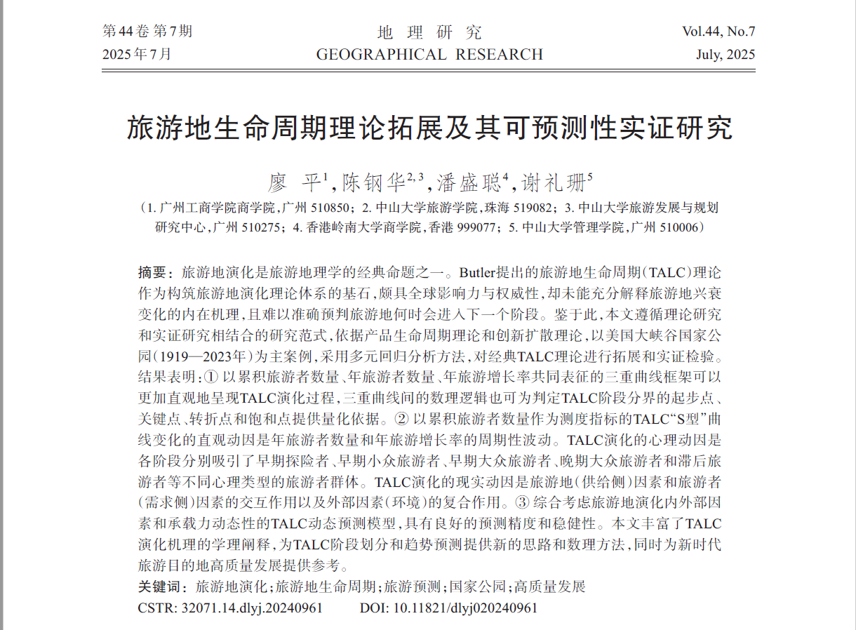 近日,我院市场营销教研室廖平博士与中山大学旅游学院陈钢华教授,香港岭南大学商学院潘盛聪教授,中山大学管理学院谢礼珊教授合作完成的最新研究成果《旅游地生命周期理论拓展及其可预测性实证研究》在国内权威期刊《地理研究》2025年第7期发表,我院为第一单位,中山大学管理学院为通讯单位。《地理研究》是由中国科学院地理科学与资源研究所与中国地理学会联合主办的中文权威期刊(CSSCI、CSCD),具有较高的学术影响力(2024 IF=5.719)。该文融合经济学、营销学、地理学等多学科研究视角与方法,对经典旅游地生命周期理论进行拓展并对其可预测性进行实证。