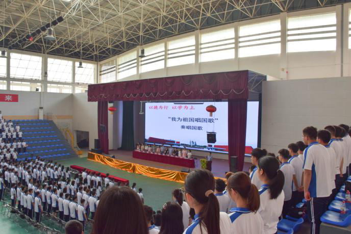 在入学教育正式开始之前,在场师生全体起立,奏唱国歌,为中华人民共和国成立70周年献礼。