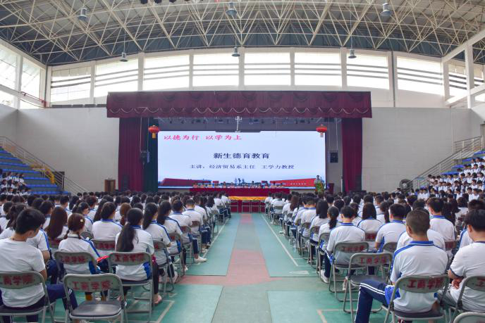2019年9月9日上午8时经济贸易系新生入学教育在花都校区体育馆顺利举行。莅临现场的领导嘉宾有:经贸系主任王学力教授、经贸系副主任马超平副教授、经贸系副主任张娜老师、经贸系张晓英副教授、经贸系办公室主任黄享政老师、经贸系党总支副书记雷婧老师、经贸系学工组长毛拓艺老师、经贸系学工组副组长黎晓琪老师、经贸系团总支书记黄彩微老师及经贸系19级全体辅导员。