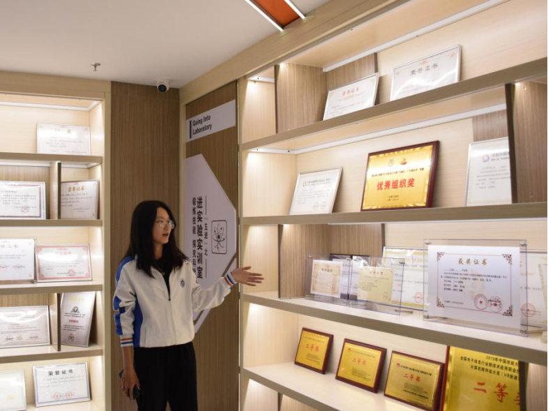 讲解员讲述着学校所获荣誉