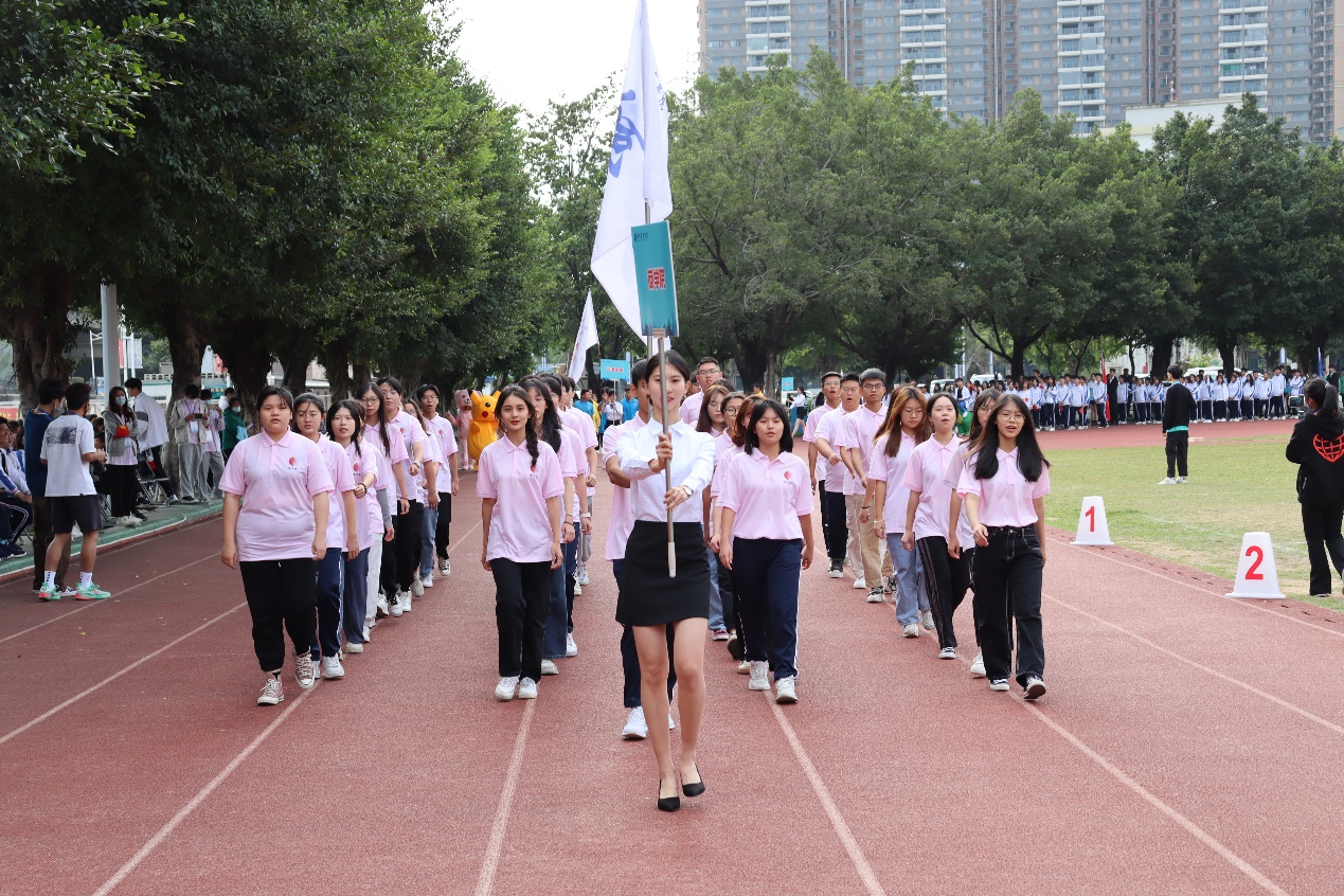 主持人宣布运动会开幕式开始,各院代表方阵陆续出场。当商学院代表方阵出场时喊起了响亮的口号,队员们精神抖擞、斗志昂扬地踏步走来,成为运动会开幕式上一道靓丽的风景。