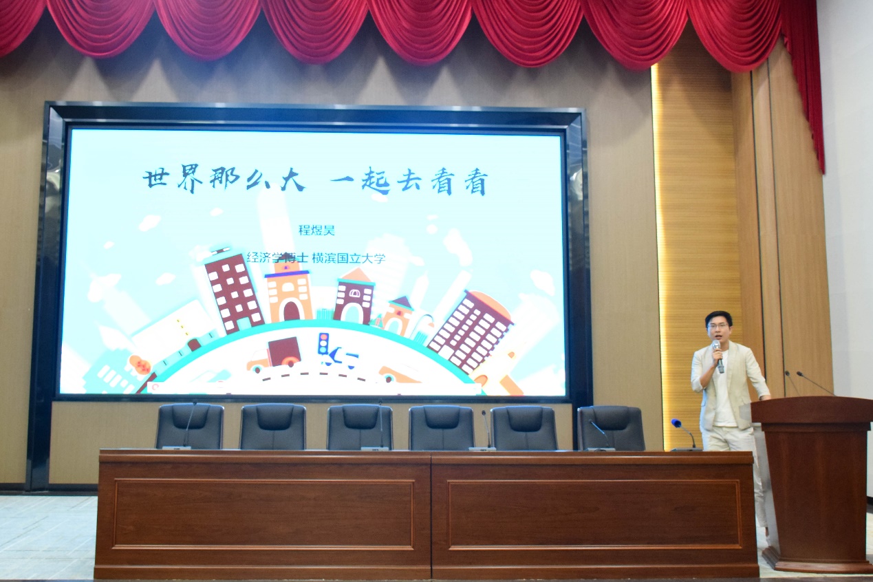 讲座的开始,程煜昊博士从收入、支出、社交、人文和人身安全等几个方面作为切入点,分析可能会遇到关于留学的问题,并为大家提供了解决问题的方法和建议,指出因时代发展,我们大学生要国际化,要走出去,不能将自己束缚住。程煜昊博士鼓励未来要留学的学生要精通外语的学习,提高自己的GPA,找到自己的方向形成自己的独特见解。博士发言的最后,寄语同学们自立自强,有明确的规划和发展目标。