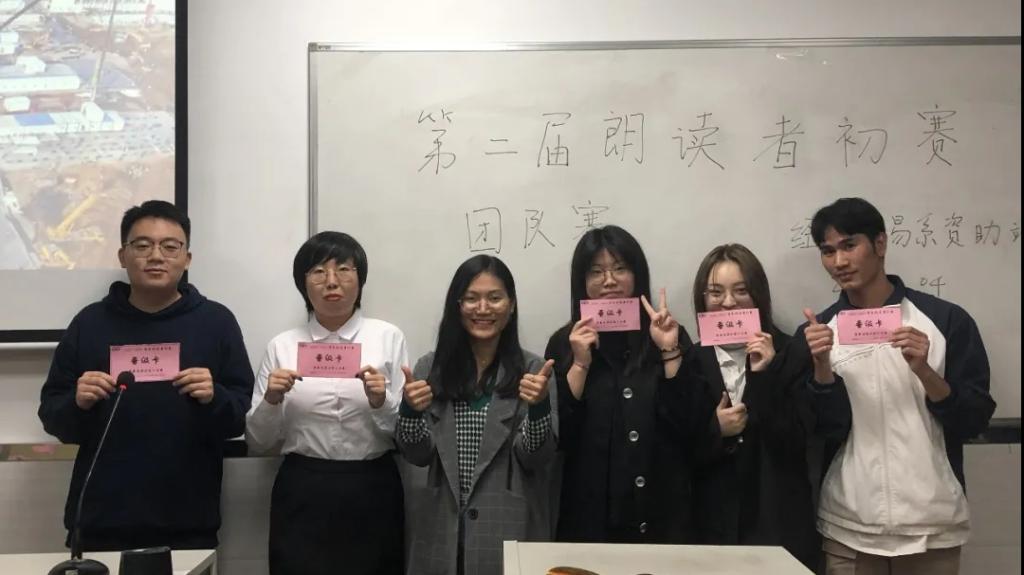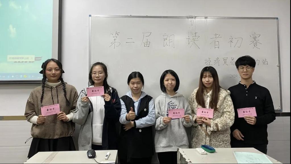“朗读者”初赛于2020年12月4日19:00-21:00在教学楼210、211举行,本次初赛分为个人赛与团队赛。本次活动初赛的嘉宾有学工组长黄彩微老师、学工副组长于佩鑫和黎晓琪老师、团总支书记谢树明老师、资助站指导老师、经贸系辅导员老师们以及经贸系师兄师姐。经过评委老师评分,个人赛区与团队赛区分别有五组选手晋级决赛,分别为吴晨红、鹿鸣、胡薛冉、莫梓沂、刘泽宏、三条人、会英小组、积极三小只、土著人、叙利亚的春天。