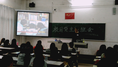 本次班会在一片热烈的掌声中展开,首先由男班贺宇鹏以ppt形式为大家介绍校园贷款的形式、案例、危害以及反思。随后同学们观看校园贷款危害的案例视频,通过这个视频同学们对校园贷款的认识也进一步加深了。 最后辅导员施继华老师向同学讲解校园贷款的危害,并警戒同学们校园贷款就在我们身边,让我们时刻提防。