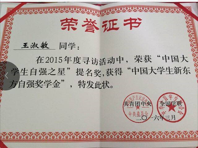 (王淑敏同学15年“中国大学生自强之星”荣誉证书)