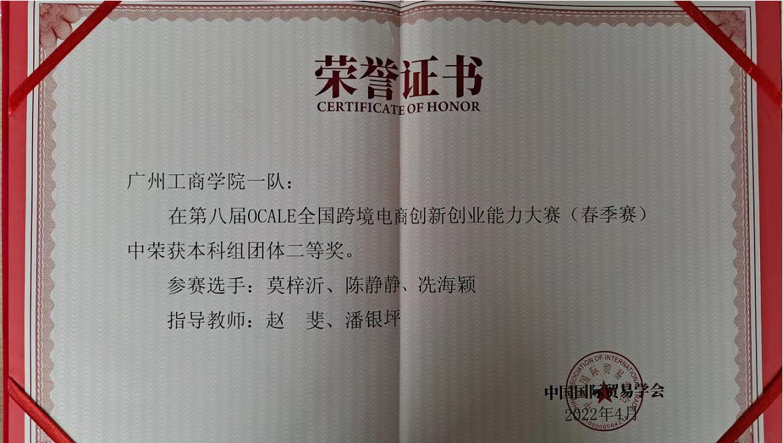 由中国国际贸易学会主办的第八届OCALE全国跨境电商创新创业能力大赛(春季赛)于2022年4月12日-4月14日举行,商学院赵斐、潘银坪老师带领的“ky开元集团官网一队”在此次比赛中获得本科组团体二等奖的好成绩。