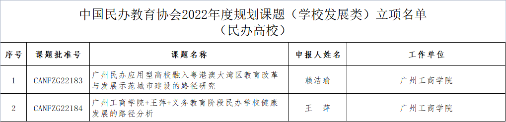 另外,根据《关于申报中国民办教育协会2022年度重大、重点课题的通知》和《关于申报中国民办教育协会2022年度规划课题的通知》规定,经专家集中评审,我院共计2项项目获批中国民办教育协会2022年度规划课题(学校发展类)立项。