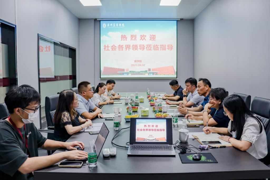 2022年9月2日下午,花都区政协副主席、区招商办主任卢日新,狮岭镇皮具皮革商会会长宋文明及秘书长梁俊钊、狮岭镇经济办周南博士和狮岭镇企业代表等一行六人受邀来到商学院走访座谈。商学院林波院长携相关负责人出席座谈会。