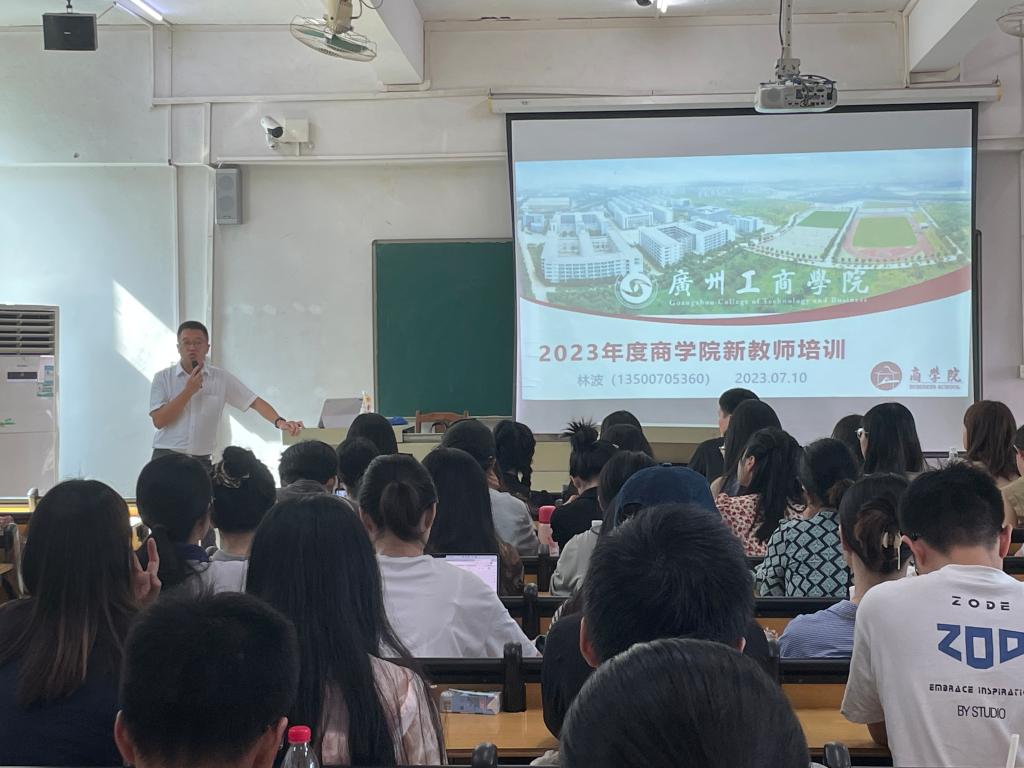 林波院长代表学院及老教师对新入职的教师表示热烈欢迎,从四个维度做了分享:首先,介绍了商学院的历史沿革。对发展历程、机构设置、师资数量与结构、学生规模与专业分布、实验实训条件、办学成效(教学成效、学科专业建设)等进行了具体介绍,接着,介绍了商学院文化——新时代商科育人理念,围绕院训“崇德致知,弘商济民”及育人理念“立德树人、知行合一、投身时代、学商为民”,融入有趣实用的思政元素、进行了详实的讲解;对院徽设计的介绍进一步肯定了我院是扎根粤港澳大湾区、岭南本土的新时代商科学院。从人心(自信心、上进心、归属心)及风气(想做事、能做事、会做事、做实事、做成事)两大基本保障出发,介绍了商学院文化的顶层设计,把文化落实到关键工作及重点推进事宜。第三,讲解了新时代高校教师职业行为十项准则,强调教师们必须严格遵守。最后,给新教师提了几点宝贵的建议,强烈建议教师们经过了学院的实战性的培训、暑假期间结合自己即将上的课程做好充足的准备,9月步入真正的课堂、上好每一堂课。